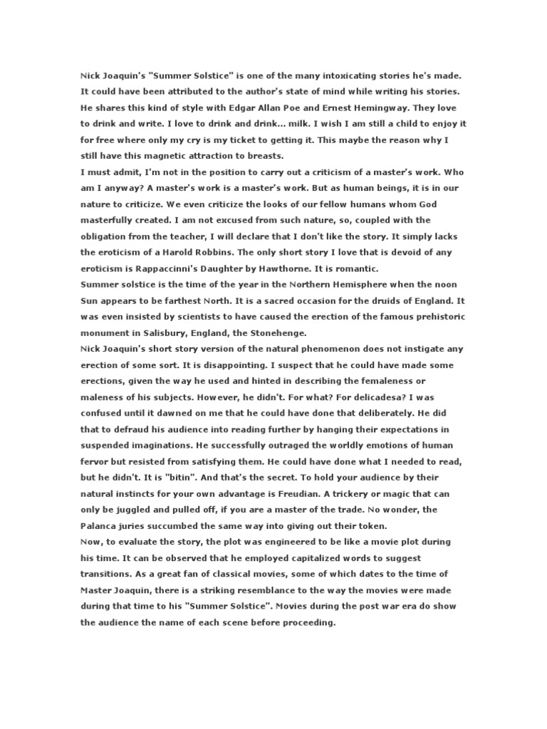 Nick Joaquin’s “Summer Solstice” is one of the many intoxicating stories he's made. It could have been attributed to the author’s state of mind while writing his stories. He shares this kind of style with Edgar Allan Poe and Ernest Hemingway.